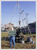 地盤強度を調べるのに、最も一般的な方法で、砂層・粘土層に適しています。戸建住宅向けの地盤調査のほとんどが本試験によって実施されます。スクリューポイントを取り付けたロッドの頭部に1kN(100kg)まで荷重を加えて、ロッドがどれだけ地中に貫入するかを測ります。貫入が止まった後、ハンドルに回転を加えてさらに地中にねじ込み、25cmねじ込むのに必要な回転数を測定。その結果を基に地盤の強度を判断します。調査においてはフルオート機(写真)を使用して測定します。調査可能範囲は深度8m程度です。
