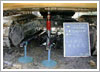 柔らかい地面の上に重くて高い建物を作ると、建物の下の地面が破砕して建物が倒れる、もしくは地盤沈下を引き起こすかもしれません。建物を作る前にあらかじめ調査する必要があります。このようなときに利用される試験が平板載荷試験です。地面に直径30cmの鉄製円板を敷いて、この円板に油圧ジャッキで力をかけていきます。円板を押す力が大きくなると円板が地面の中に沈んでいきます。この押す力と円板の沈んだ深さの関係から地面がどれだけの重さを支えることができるかどうかを調べます。